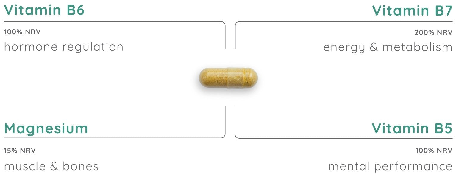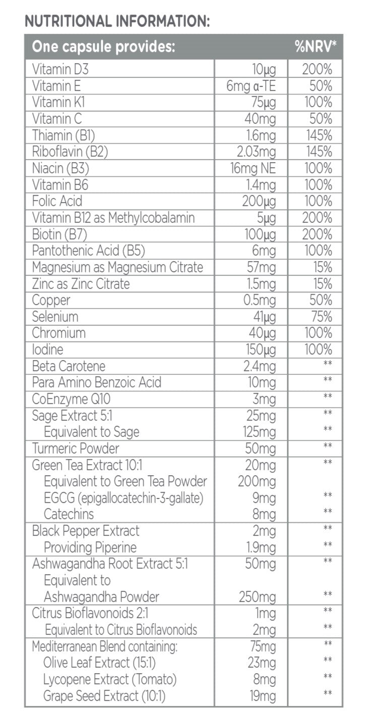 Magnesium Citrate, Capsule Shell (Hydroxypropyl Methylcellulose), Turmeric Powder (Curcuma longa), Ashwagandha Root Extract 5:1 (Withania somnifera), Vitamin C (Ascorbic Acid), Microcrystalline Cellulose, Sage Extract 5:1 (Salvia officinalis), Olive Leaf Extract 15:1 (Olea europaea L.), Anti-caking Agents (Magnesium Stearate, Silicon Dioxide), Green Tea Extract 10:1 (Camellia sinensis), Grape Seed Extract 10:1 (Vitis vinifera L.), Vitamin B3 (Nicotinamide), Maltodextrin, Para Amino Benzoic Acid, Beta Carotene (Dunaliella salina), Vitamin E Succinate, Pantothenic Acid (Calcium D-Pantothenate), Lycopene Extract, Zinc Citrate, Arabic Gum, Corn Syrup, Co Enzyme Q10, Thiamine Hydrochloride, Riboflavin, Black Pepper Extract (Piper nigrum), Pyridoxine Hydrochloride, Copper Sulphate, Citrus Bioflavonoids, Vitamin D3 Oil (Cholecalciferol, Fractionated Coconut Oil, D Alpha Tocopherol), Folic Acid (Pteroylmonoglutamic Acid), Potassium Iodide, Vitamin K1 (Phylloquinone), Chromium Chloride, Vitamin B7 (D-Biotin), Antioxidant (Sodium Ascorbate), L-Selenomethionine, Vitamin B12 (Methylcobalamin).