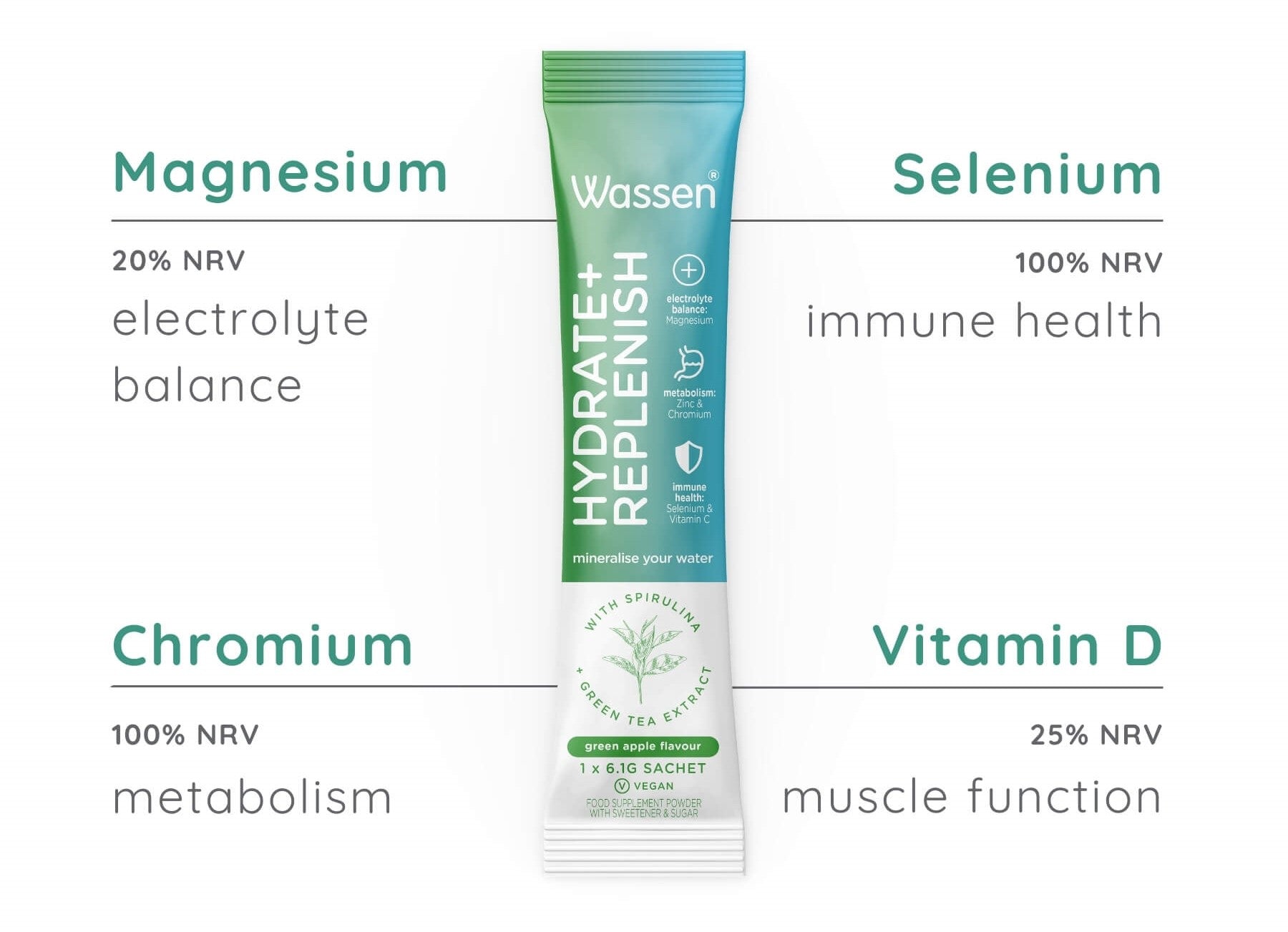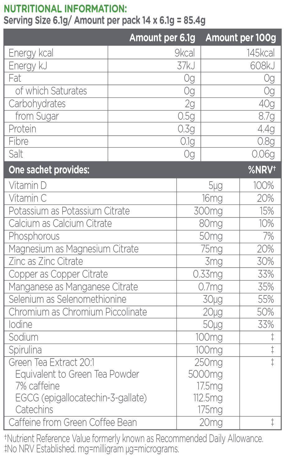 Acidity Regulator (Citric Acid), Tri-Potassium Citrate, Magnesium Citrate, Natural Flavouring, Tri-Sodium Citrate, Calcium Citrate, Sweetener (Enzymatically Produced Steviol Glycosides), Potassium Phosphate, Green Tea Extract (20:1) 7% Caffeine, Colour (Copper Chlorophyllin), Anti-Caking Agent (Silicon Dioxide), Spirulina, Caffeine (from Green Coffee Beans), Ascorbic Acid, Zinc Citrate, Selenomethionine, Manganese Citrate, Vitamin D (Ergocalciferol), Copper Citrate, Chromium Picolinate, Potassium Iodide.