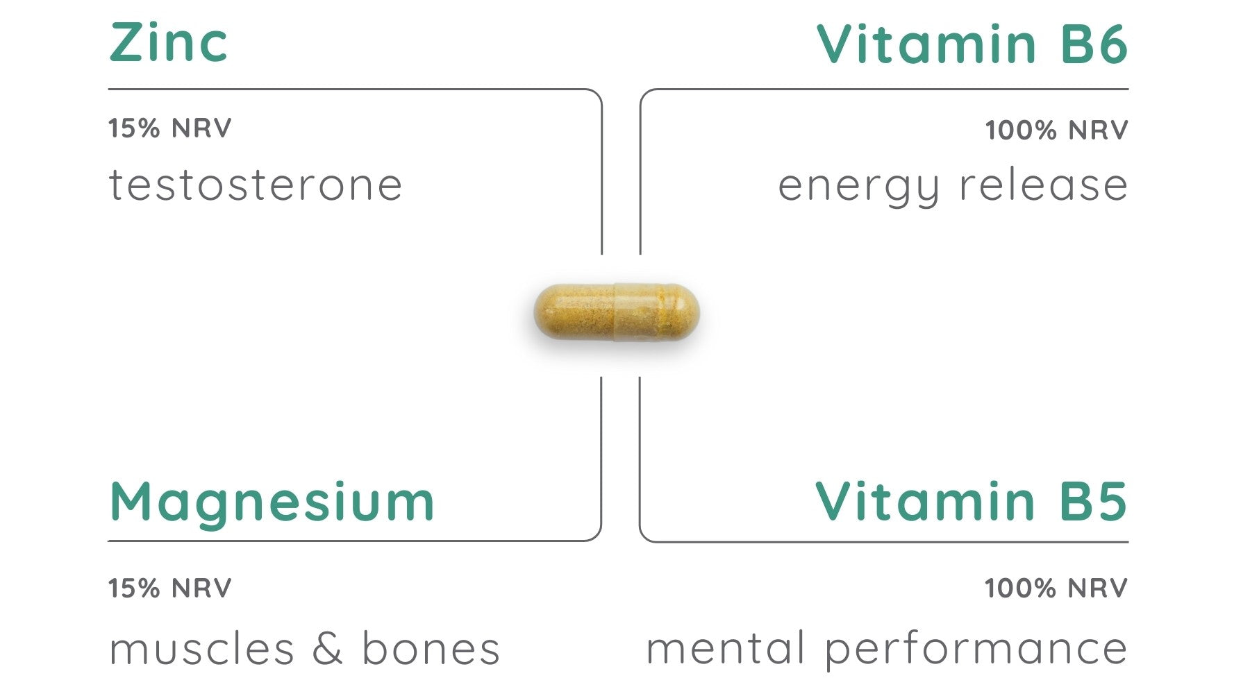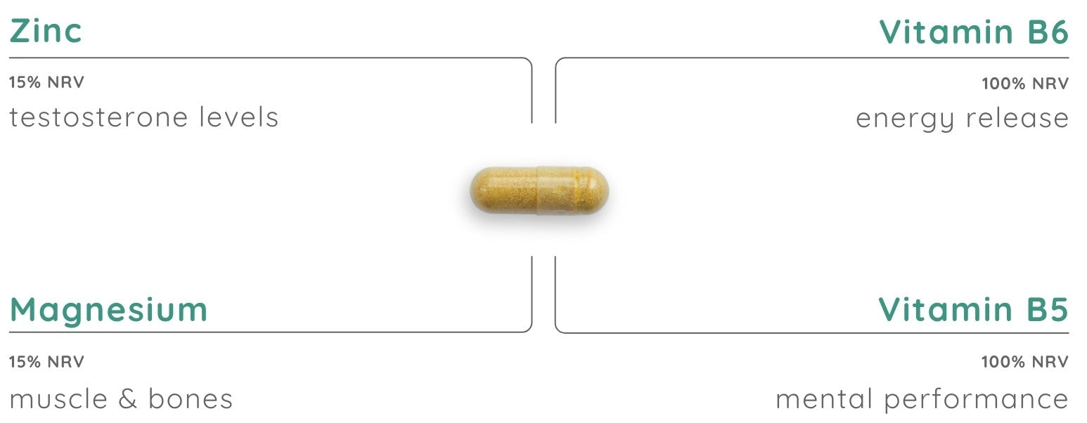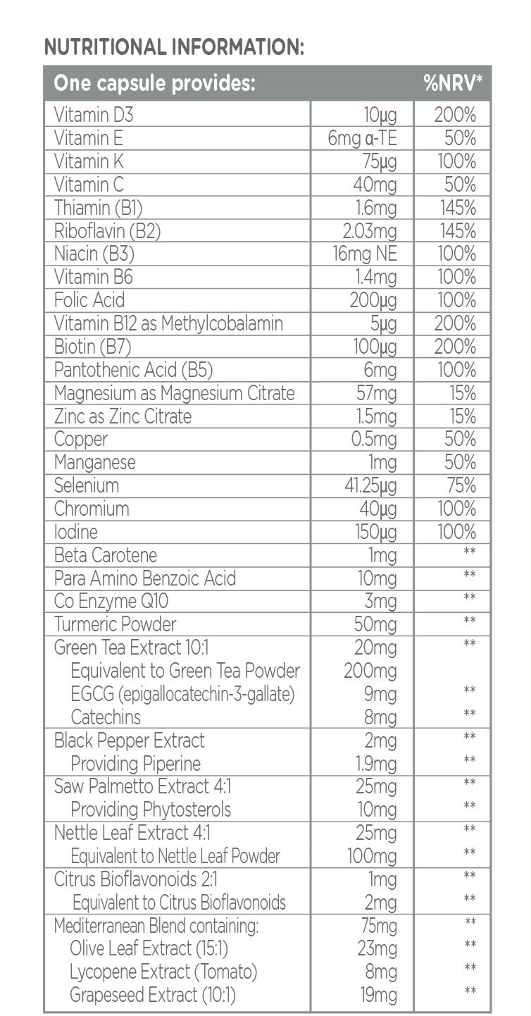 Magnesium Citrate, Capsule Shell (Hydroxypropyl Methylcellulose), Turmeric Powder (Curcuma longa), Vitamin C (Ascorbic Acid), Microcrystalline cellulose, Saw Palmetto Extract 4:1 (Serenoa repens), Nettle Leaf Extract 4:1 (Urtica dioica L.), Olive Leaf Extract (Olea europaea L.), Anti-caking Agent (Magnesium Stearate, Silicon Dioxide), Green Tea Extract 10:1 (Camellia sinensis), Grape Seed Extract 10:1 (Vitis vinifera L.), Vitamin B3 (Nicotinamide), Maltodextrin, Para Amino Benzoic Acid, Vitamin E Succinate, Pantothenic Acid (Calcium D-Pantothenate), Lycopene Extract, Zinc Citrate, Beta Carotene (Dunaliella salina), Corn Syrup, Co Enzyme Q10, Arabic Gum, Manganese Sulphate, Thiamine Hydrochloride, Riboflavin, Black Pepper Extract (Piper nigrum), Vitamin B6 (Pyridoxine Hydrochloride), Copper Sulphate, Citrus Bioflavonoids 2:1, Vitamin D3 Oil (Cholecalciferol, Fractionated Coconut Oil, D alpha Tocopherol), Folic Acid (Pteroylmonoglutamic acid), Potassium Iodide, Vitamin K1 (Phylloquinone), Chromium Chloride, Vitamin B7 (D-Biotin), Antioxidant (Sodium Ascorbate), L-Selenomethionine, Vitamin B12 (Methylcobalamin).